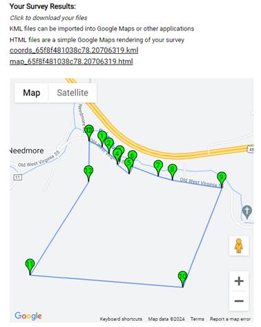 The .html file can be saved and opened in your browser to see a Google Map representation of your survey. Save it somewhere handy for a quick view of your perimeter shape. A small version is shown on your results page for clarity.